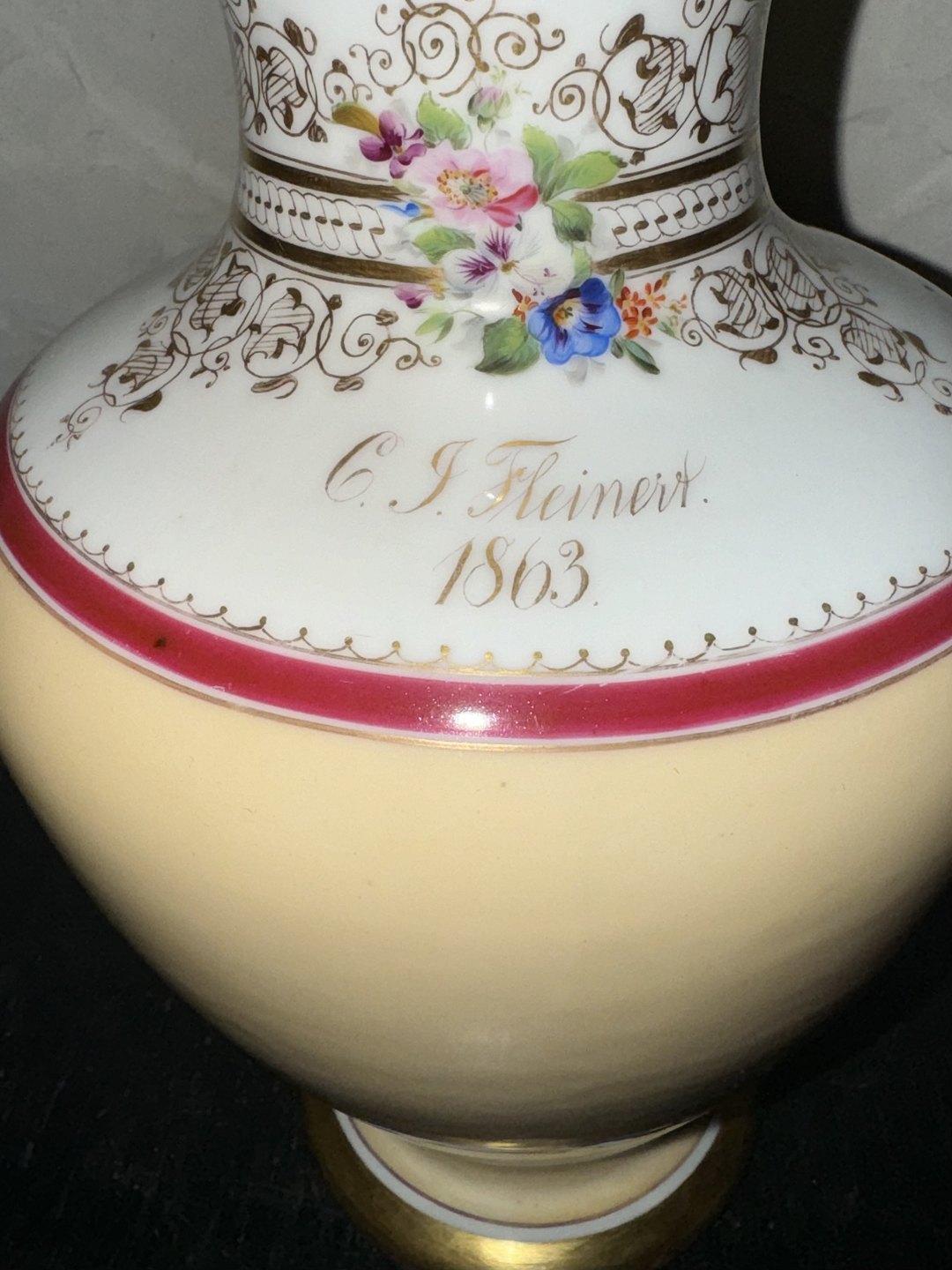 Stor chokolade kande i porcelæn fra Bing & Grøndahl. Dekoreret med blomster og navnetræk C. J. Fleinert 1863. Fremstår i perfekt stand. Fabriksmærket på bunden i blåt med det velkendte B&G fabriksmærke. H. 27 cm