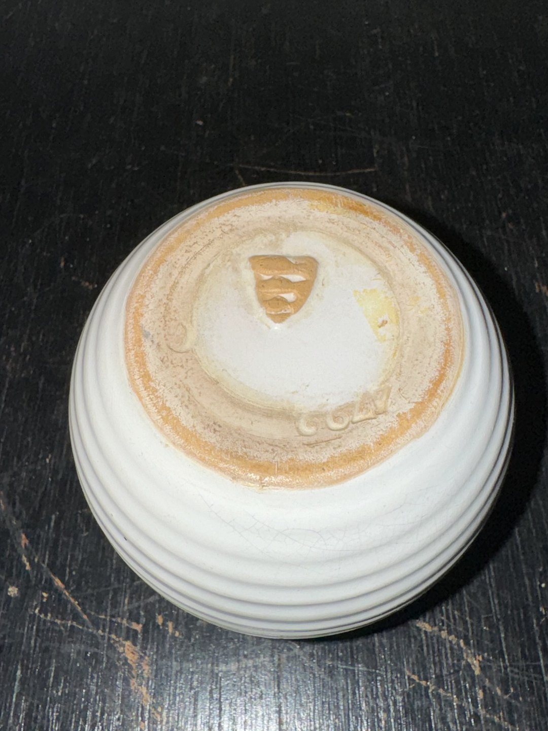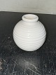 Mindre hvidglaseret rund vase med vandrette riller fra Michael Andersen & Søn. I god stand. Fabriksmærket på bunden. H. 8,4 cm