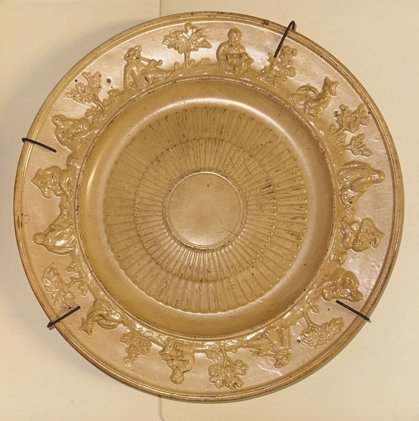 Fad i keramik. Dekoreret med arbejdende kinesere. Formodes fremstillet på Bornholm omkring 1880. Brugsspor på overfladen. Ingen skader. Mål: 2,8 cm Ø. 24,3 cm