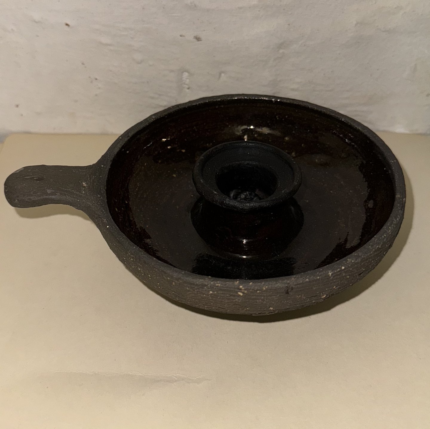 Lysestage i form af kammerstage i keramik på tre ben. Designet og fremstillet af Gutte Eriksen. Rå på ydersiden og glaseret indvendigt. Signeret af kunstneren på undersiden med “Gutte”. Mål: H. 5,5 cm L. 18,5 cm