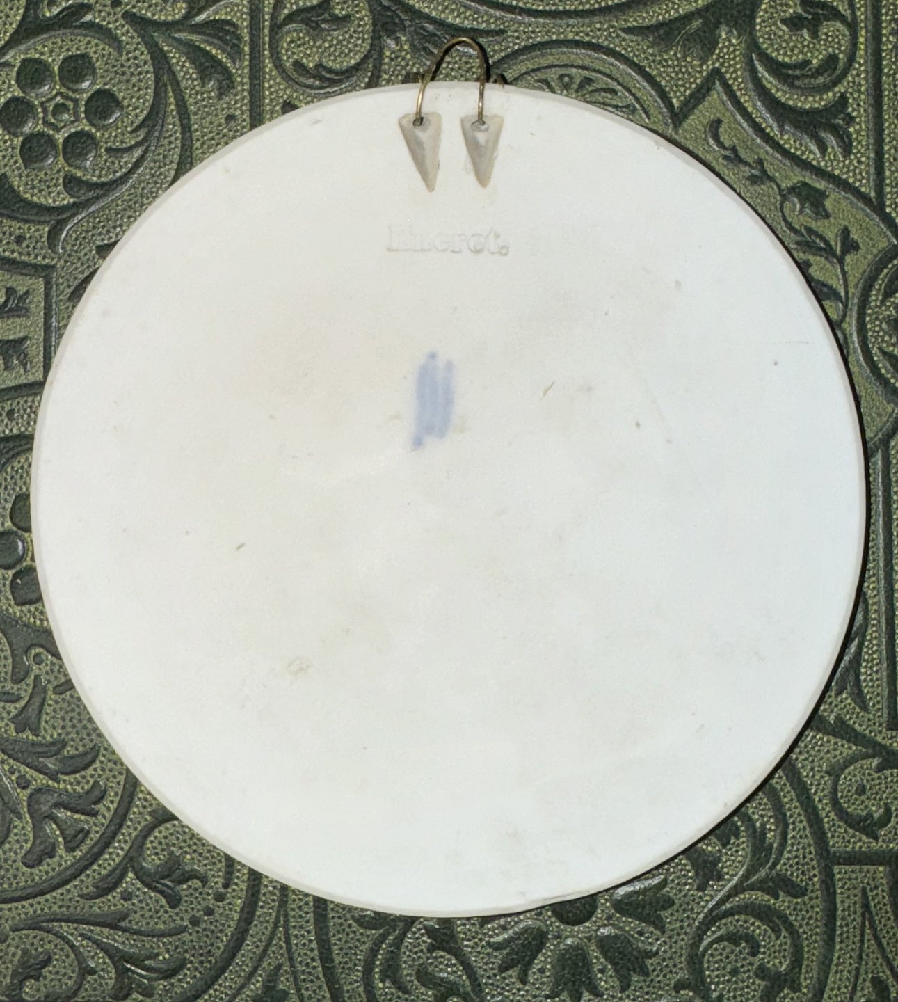 Platte i porcelæn bisquit fra Royal Copenhagen i slutningen af 19. århundrede. Bertel Thorvaldsen (1770-1844) motiv med “Hyrdinde med amorinrede”. Efter relief modelleret i Rom i 1831. Fabriksmærket på bagsiden med de velkendte tre blå bølger for Royal Copenhagen. Har et meget lille skår nederst på plattens kant (se foto). Ellers i god stand. Diameter på 13 cm.