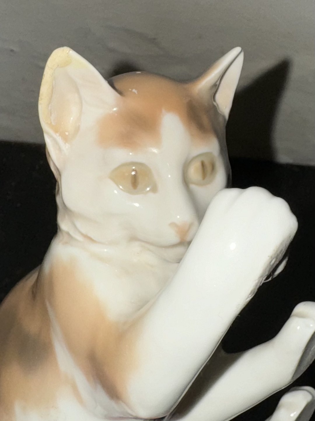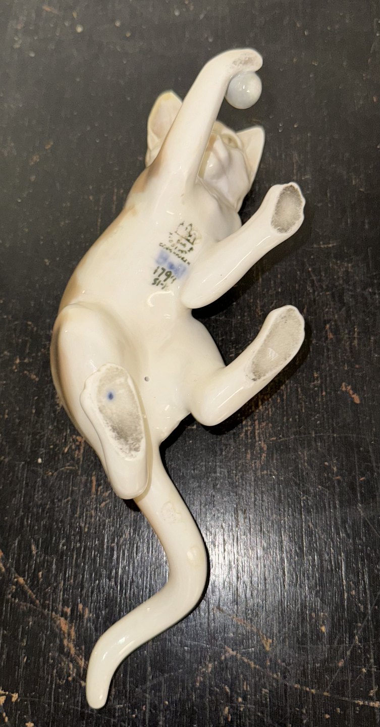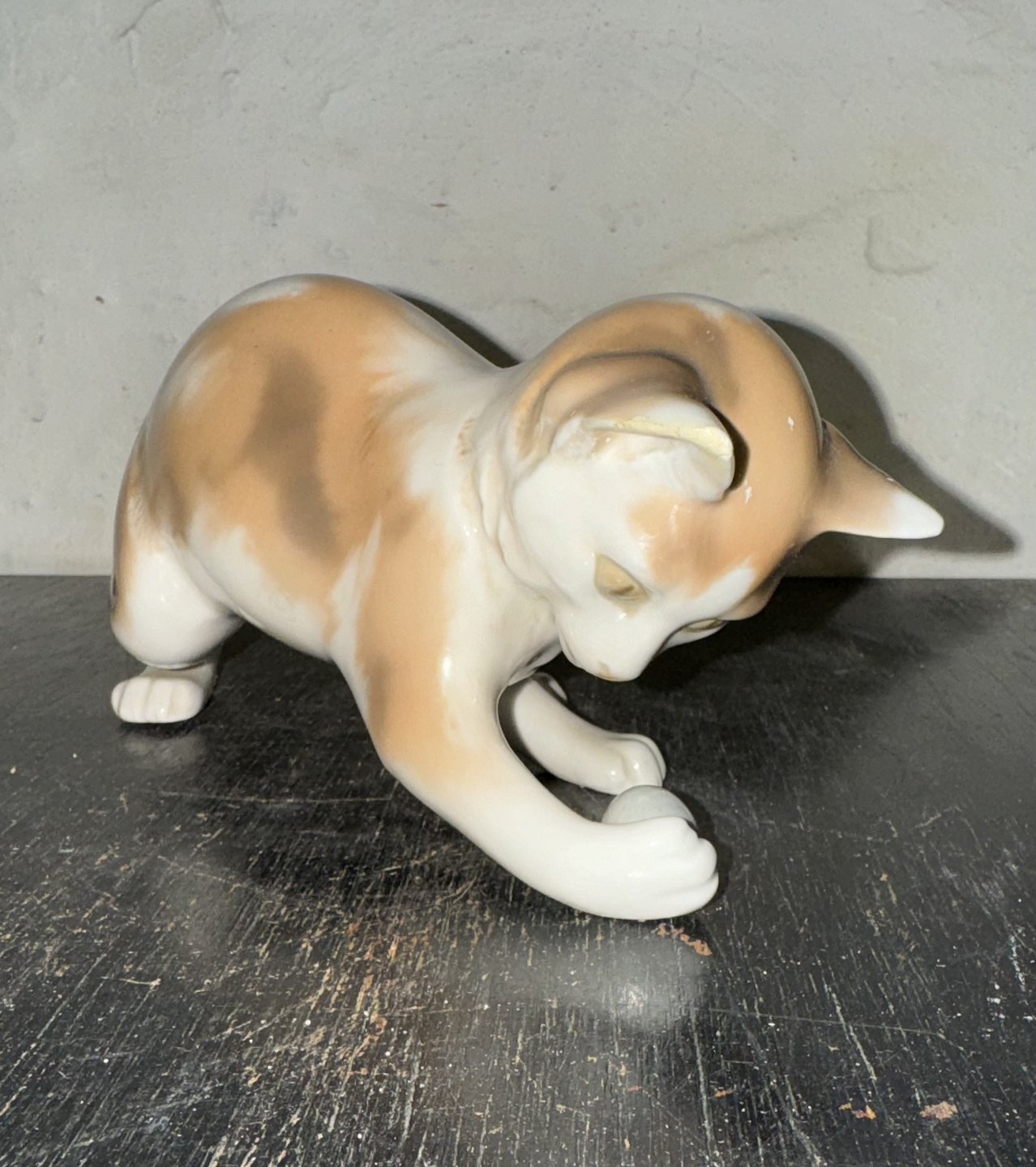 Bing & Grøndahl: Tidlig figur i porcelæn af kat der leger med bold. Fremstillet i begyndelsen af 20. århundrede. Reparation på højre øre, hvilket fremgår af fotografierne. Fabeiksmærket på bunden. 2. Sortering. Mål: H. 8,5 cm L. 24 cm