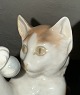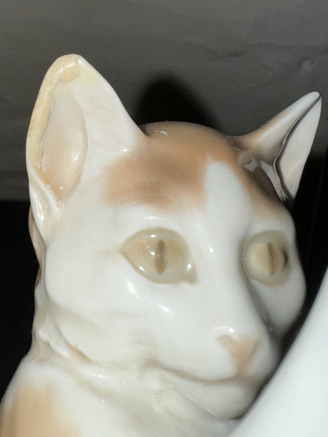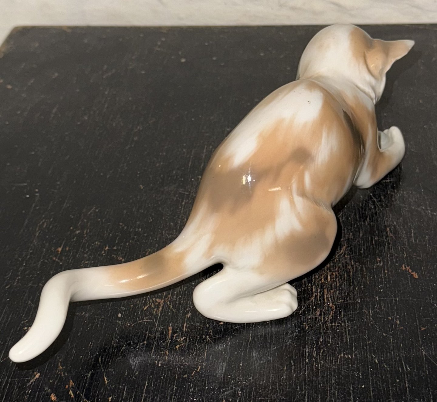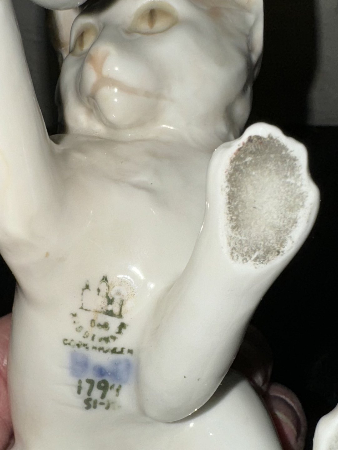 Bing & Grøndahl: Tidlig figur i porcelæn af kat der leger med bold. Fremstillet i begyndelsen af 20. århundrede. Reparation på højre øre, hvilket fremgår af fotografierne. Fabeiksmærket på bunden. 2. Sortering. Mål: H. 8,5 cm L. 24 cm