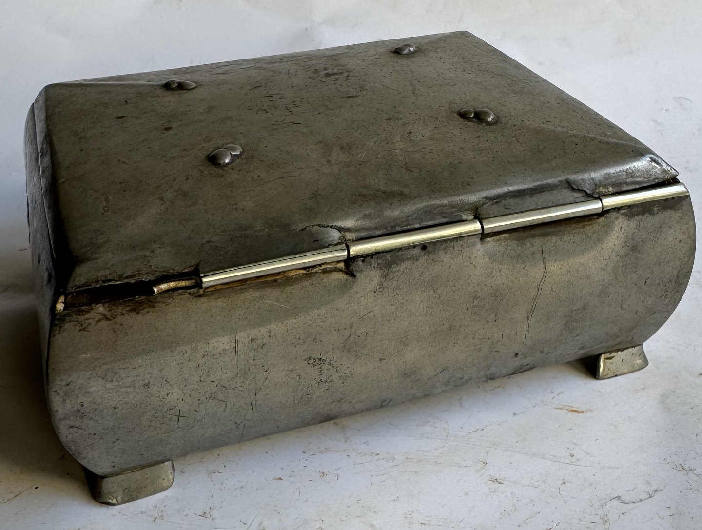 Art deco perioden: Skrin i tin. Fremstillet hos Mogens Ballin’s efterfølger Hans Peter Hertz (HPH) i 1921. Lidt brugsspor på låget. Ved hængslet (se fotos). Ellers i god stand uden skader eller reparationer. Aldersrelateret brugsspor indvendigt. Fabriksmærket på bunden med HPH. 2119. Mål: H. 5,5 cm Ø. Kassen måler 9 x 11,7 cm.