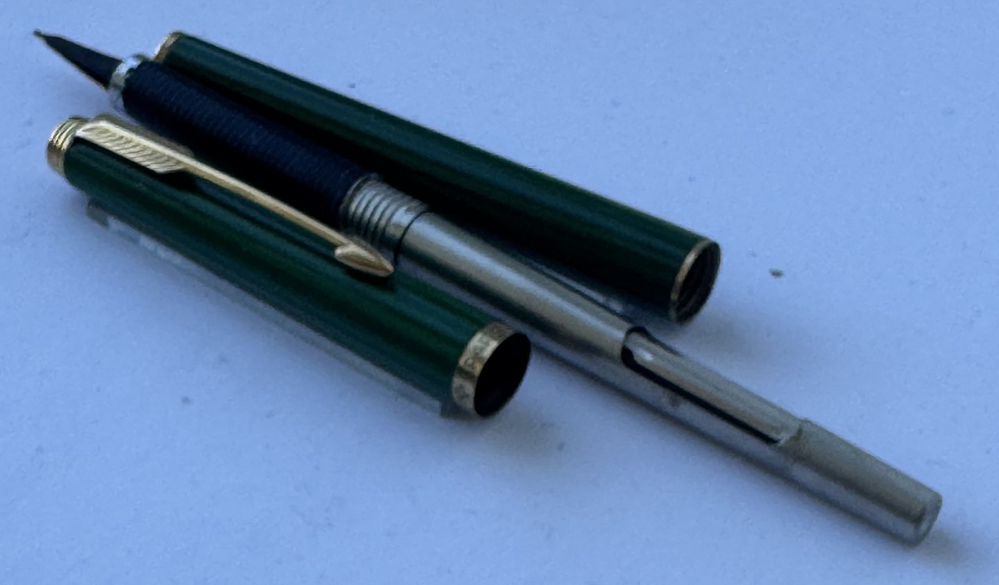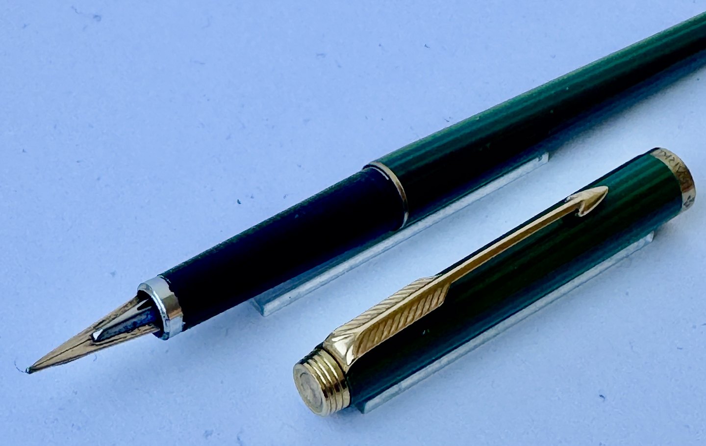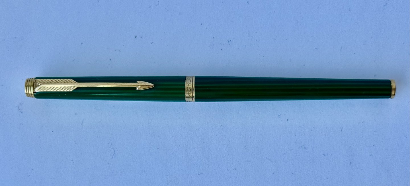 Slank grøn stribet Parker 180 Malachite fyldepen. Fremstillet i Frankrig i slutningen af 1970’erne. Klar til at blive brugt. Alle dele originale.L. 13,3 cm