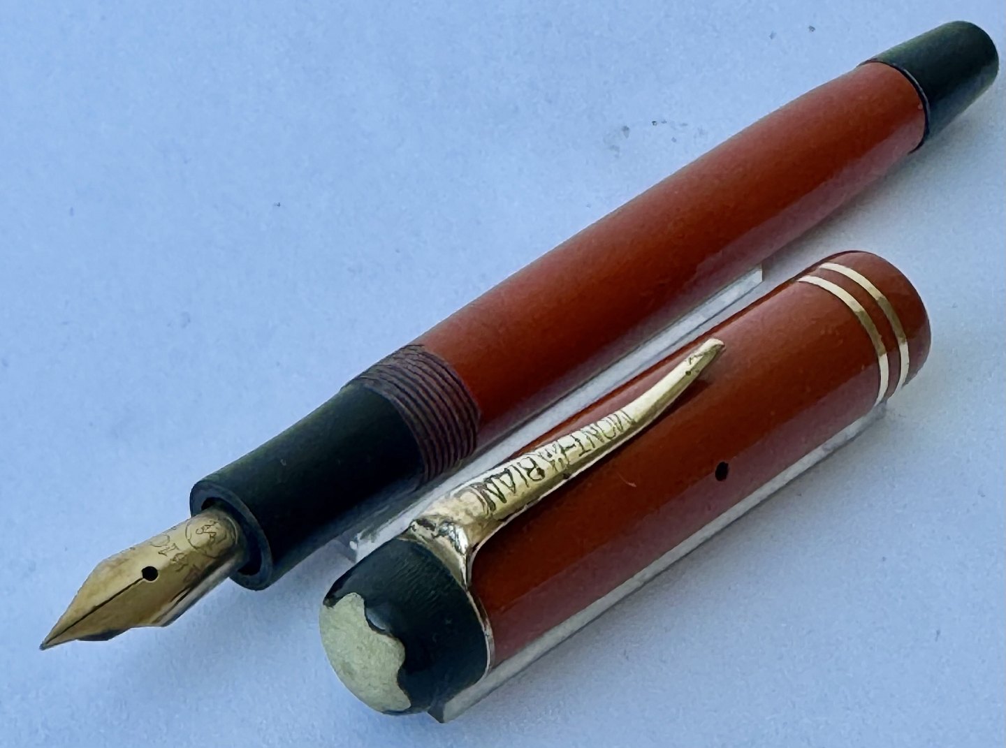 Koralrød Montblanc Simplo nr. 20 fyldepen. Push button filler. Produceret i 1930’erne i Danmark. Let udvisket fabrikslogo på “kroppen”. Enden på clip’en er knækket. Ellers ingen skader eller reparationer. Alle dele er originale Montblanc fra perioden inclusiv den flotte 14 karat guld spids. Fyldepennen fungerer ikke. Ved ekstra betaling på d.kr. 250,00 indsættes ny gummisæk, så den igen bliver funktionsduelig. Mål: L. 13 cm