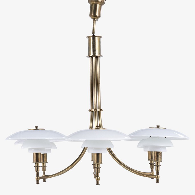 PH 3/2 - Seks-armet 'Ankerkrone' i messing med skærme i ét-lags hvidt opalglas. Formgivet mellem 1929-1936. Stemplet 'PAT. APPL.'