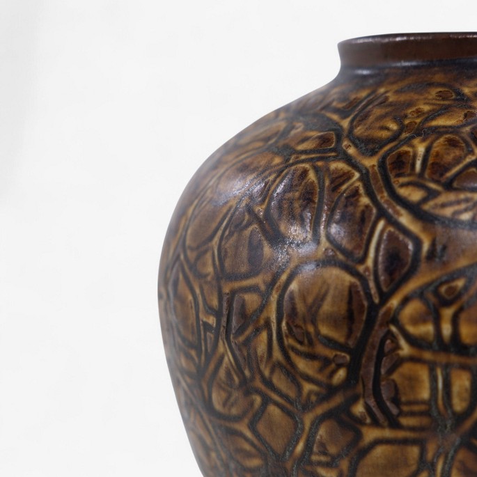 Vase i stentøj dekoreret med bladværk og brunlig glasur. Signeret.