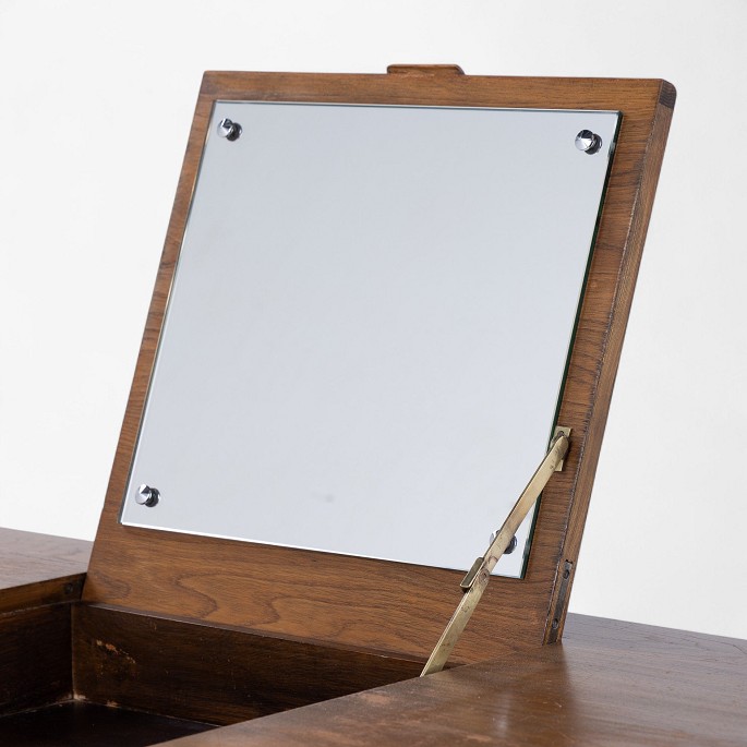 Dressing table in patinated elm wood with a folding mirror and two drawers.