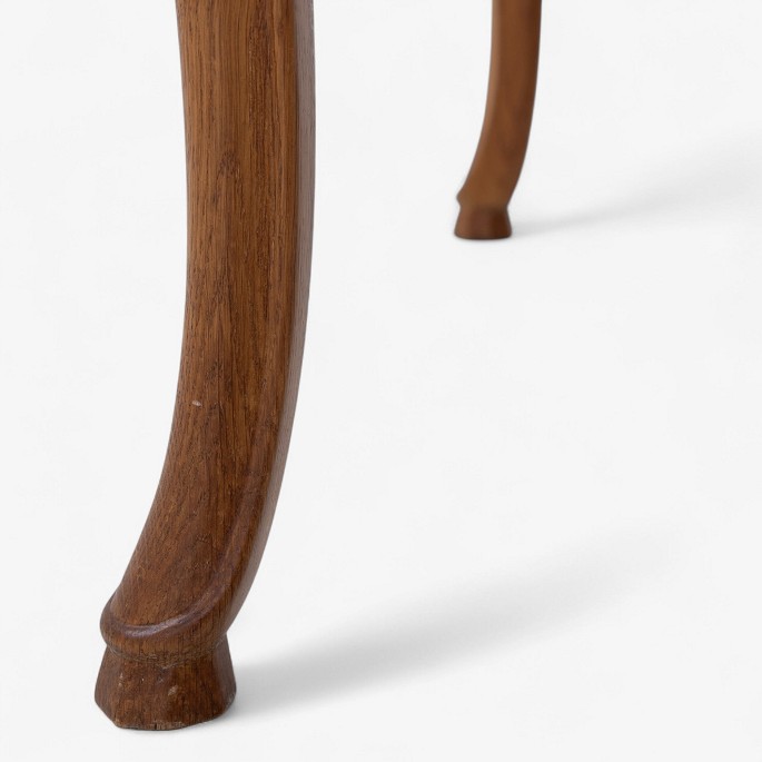 Stort skrivebord i patineret egetræ med tre skuffer og svungne ben.