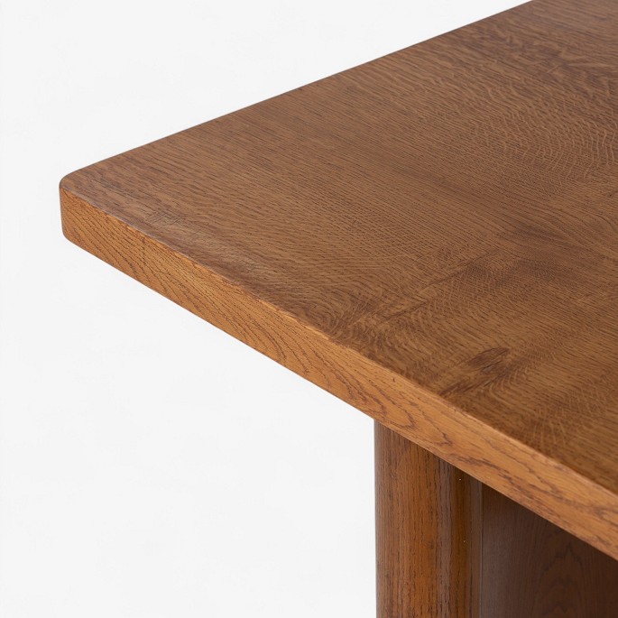 Large 'Art Deco' dining table/desk in patinated oak with curved column legs and brass shoes. From the 1930s.
