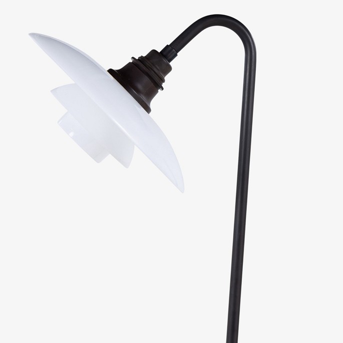 PH 3/2 - 'Syvtallet' gulvlampe med stel i bruneret messing og skærme i hvidt opalglas. Stemplet 'Patented'.