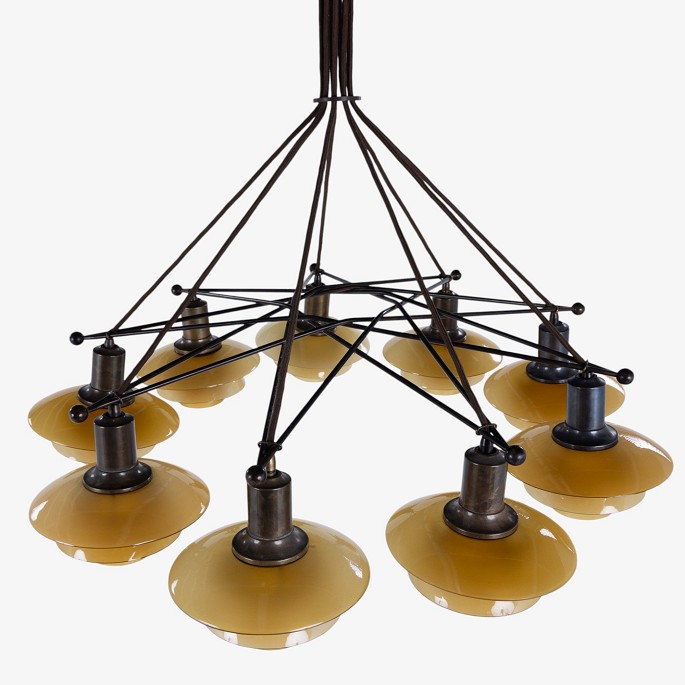 PH 2/2 - Rare 'Star Chandelier' in burnished brass with shades in amber glass. Stamped 'Patented'.