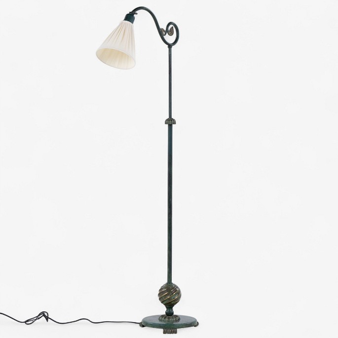 Skulpturel gulvlampe i patineret bronze med højdejustering og hvid stofskærm. Fra 1930.