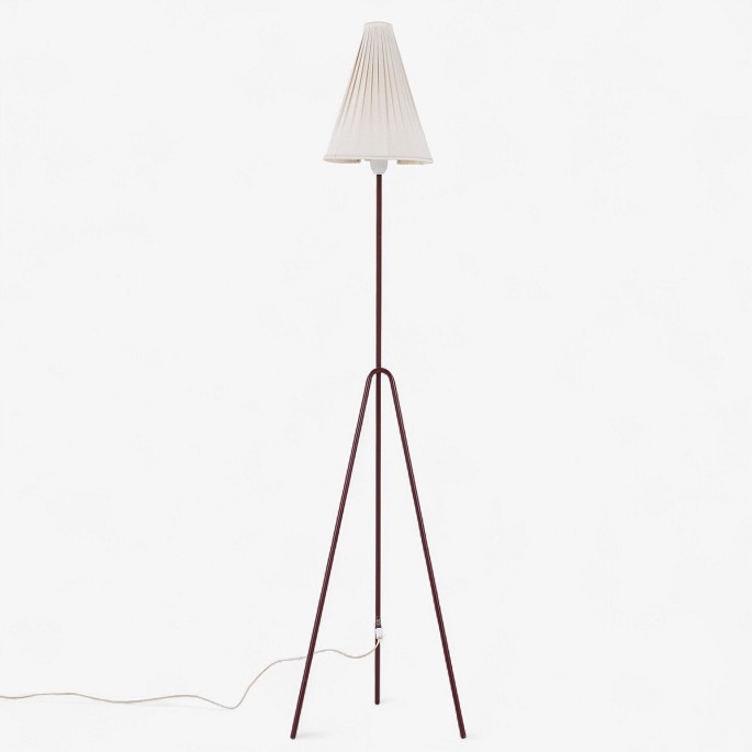 Model 569 - 'Giraffen' floor lamp with a frame in patinated red lacquered metal and a white fabric shade.