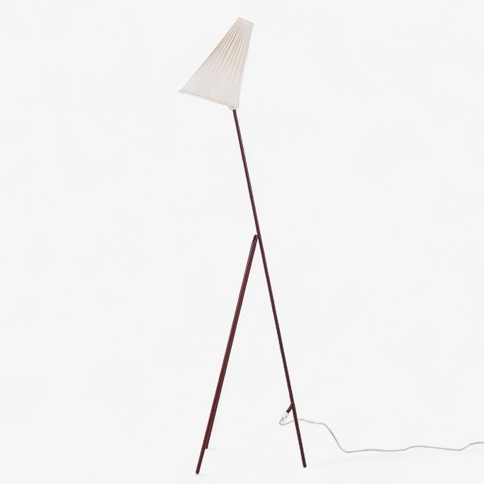 Model 569 - 'Giraffen'-gulvlampe med stel i patineret rødlakeret metal og hvid stofskærm.