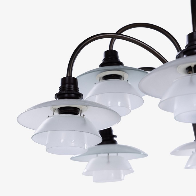 PH 1/1 - 'Bombardement'-lysekrone med 9 arme i bruneret messing og skærme i mat glas. Stemplet 'Patented'.