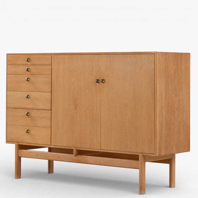 Skænk i patineret egetræ med to låger og otte skuffer m. messinggreb. Stemplet fra producent.