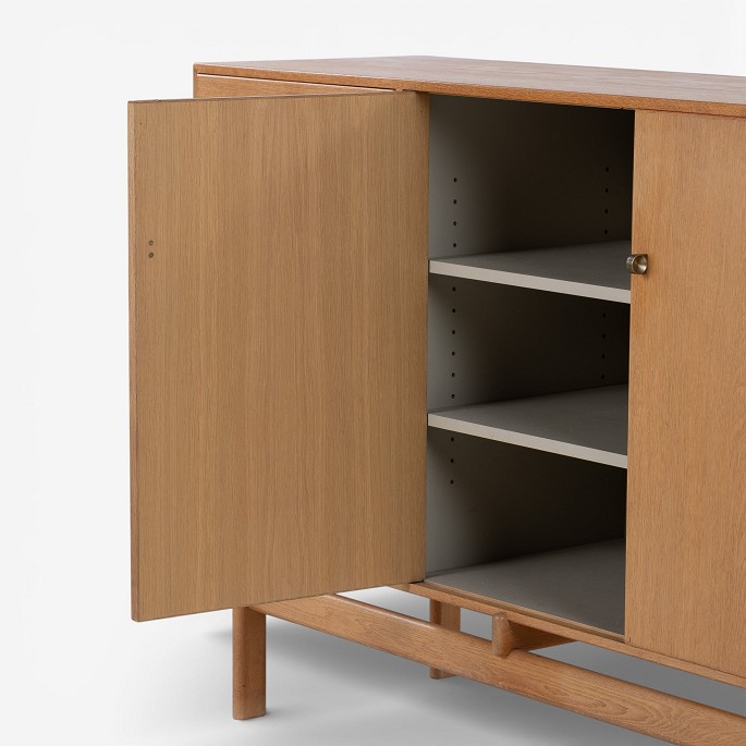Sideboard in patinated oak with two doors and eight drawers with brass handles. Stamped by manufacturer.
