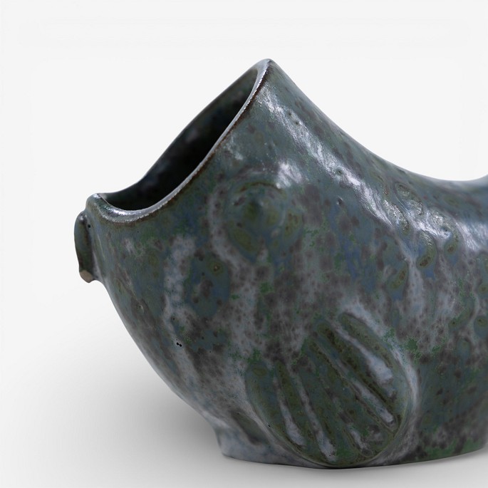 Lille fisk i stentøj med blågrøn glasur. Signeret.