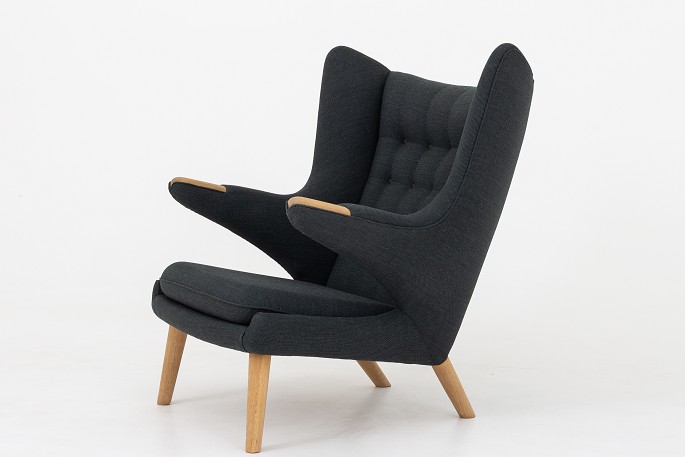 AP 19 - Nybetrukket Bamsestol i Clara 2-stof (code: 987) med knapper i Savanne-læder (farve: Coffee). Poter og ben i eg.