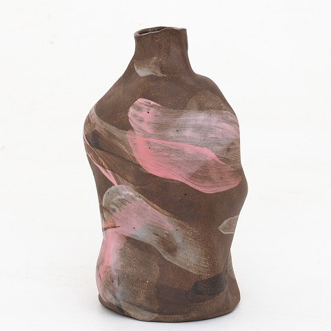 Vase i delvist uglaseret stentøj med pink, sort og hvid glasur.