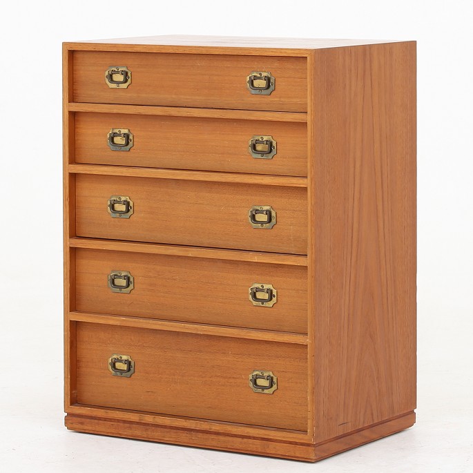 Small teak chest of drawers with 5 drawers and brass handles. A few discolorations on the top.