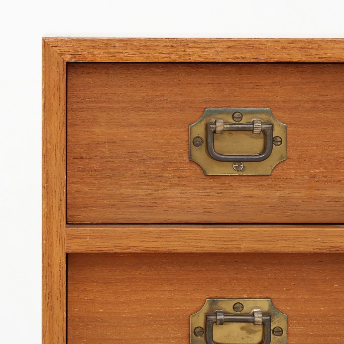 Lille kommode i teak med 5 skuffer og håndtag af messing. En lille misfarvning på toppen.
