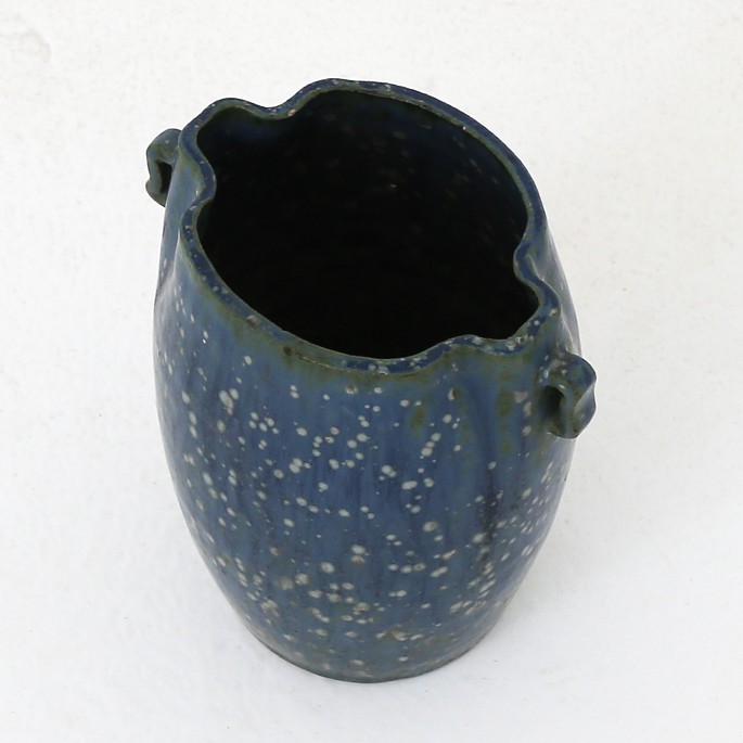 Vase i stentøj med hank og blå, spættet glasur. Model AB 55. Signeret.