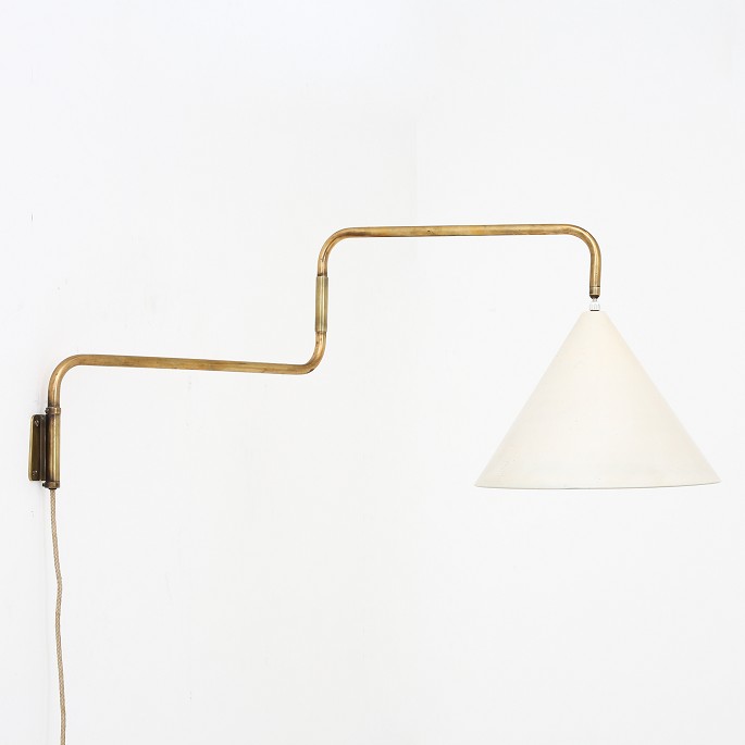 Væglampe af messing med justérbar arm og skærm af hvidlakeret metal.