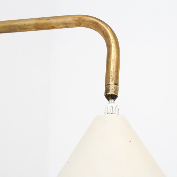 Væglampe af messing med justérbar arm og skærm af hvidlakeret metal.
