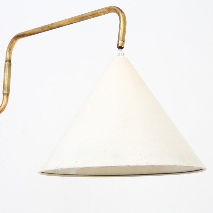 Væglampe af messing med justérbar arm og skærm af hvidlakeret metal.
