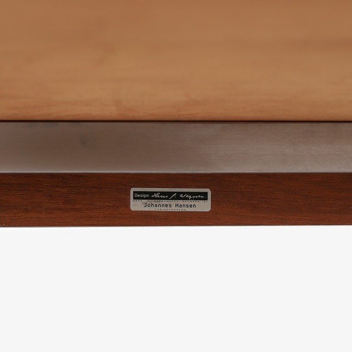 JH 810 - Fritstående skrivebord med kassetteformet top i wengé. Front med to skuffer, bøjlestel og greb af matforkromet stål. Formgivet i 1970.