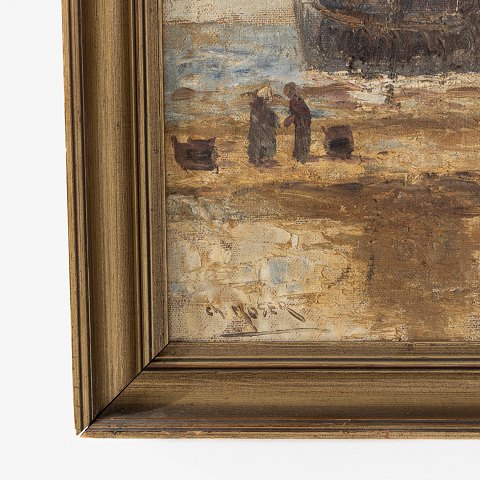 Olie på lærred. Skib på havet med guldbemalet ramme.