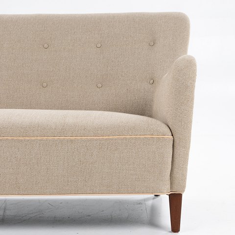 Overstuffed sofa in new Ecriture fabric (colour 0240) with natural leather piping.