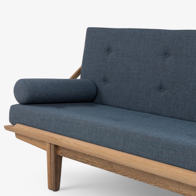 Daybed i sæbebehandlet og røget eg m. hynde i blåt 'Clara'-stof.