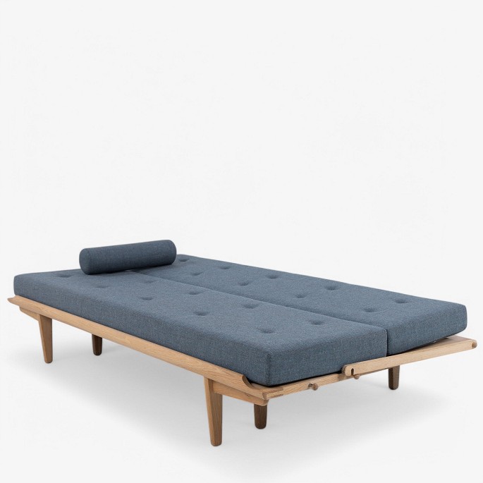 Volther Daybed in soap treated and smoked oak with cushion in blue ‘Clara’ fabric.