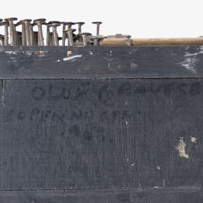 Kvadratisk skulptur i stål med søm. Signeret af kunstneren.