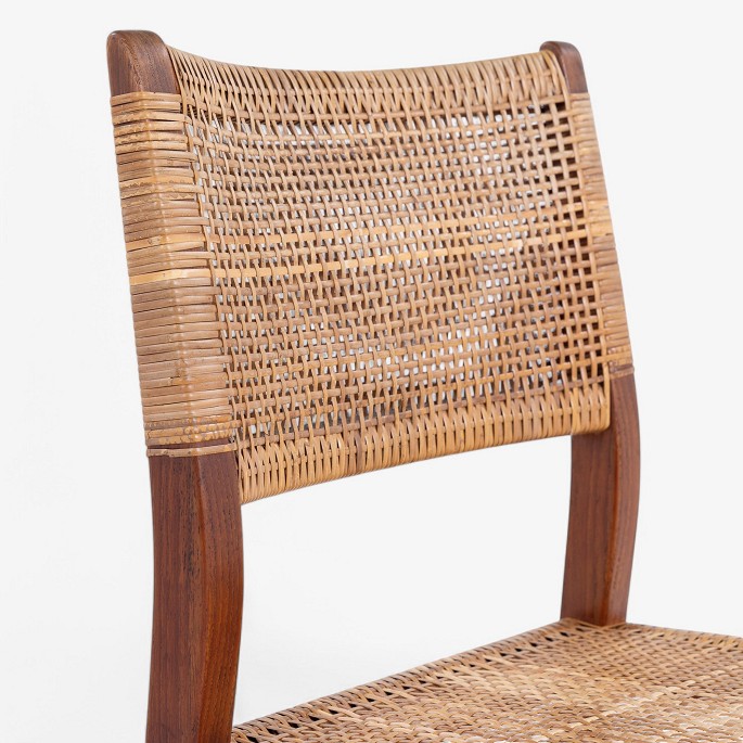 Spisestol i mahogni med sæde og ryg i patineret sjeneflet. Formgivet i 1953.