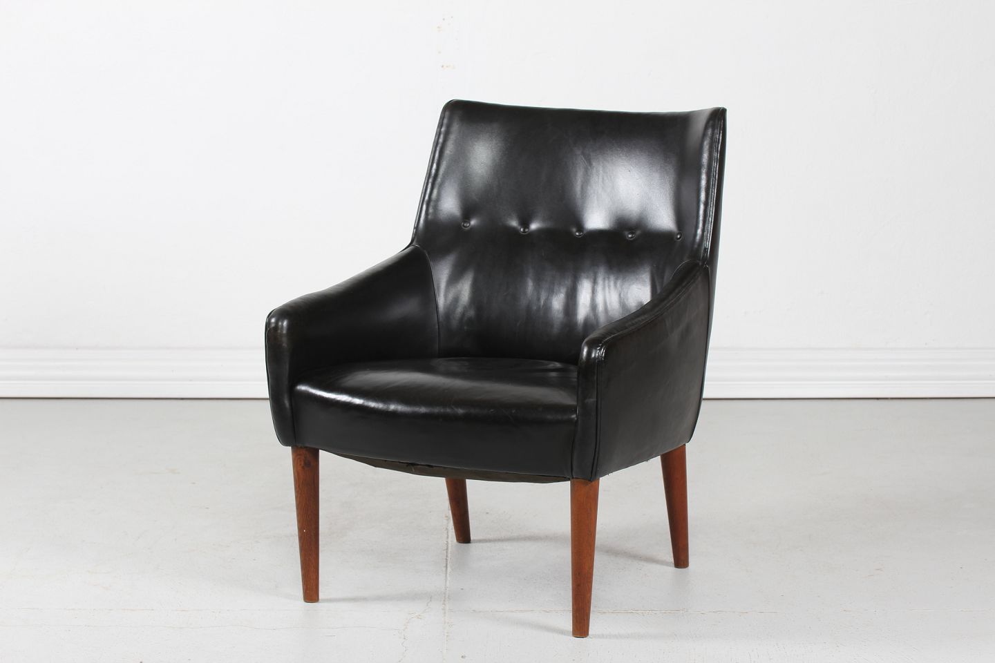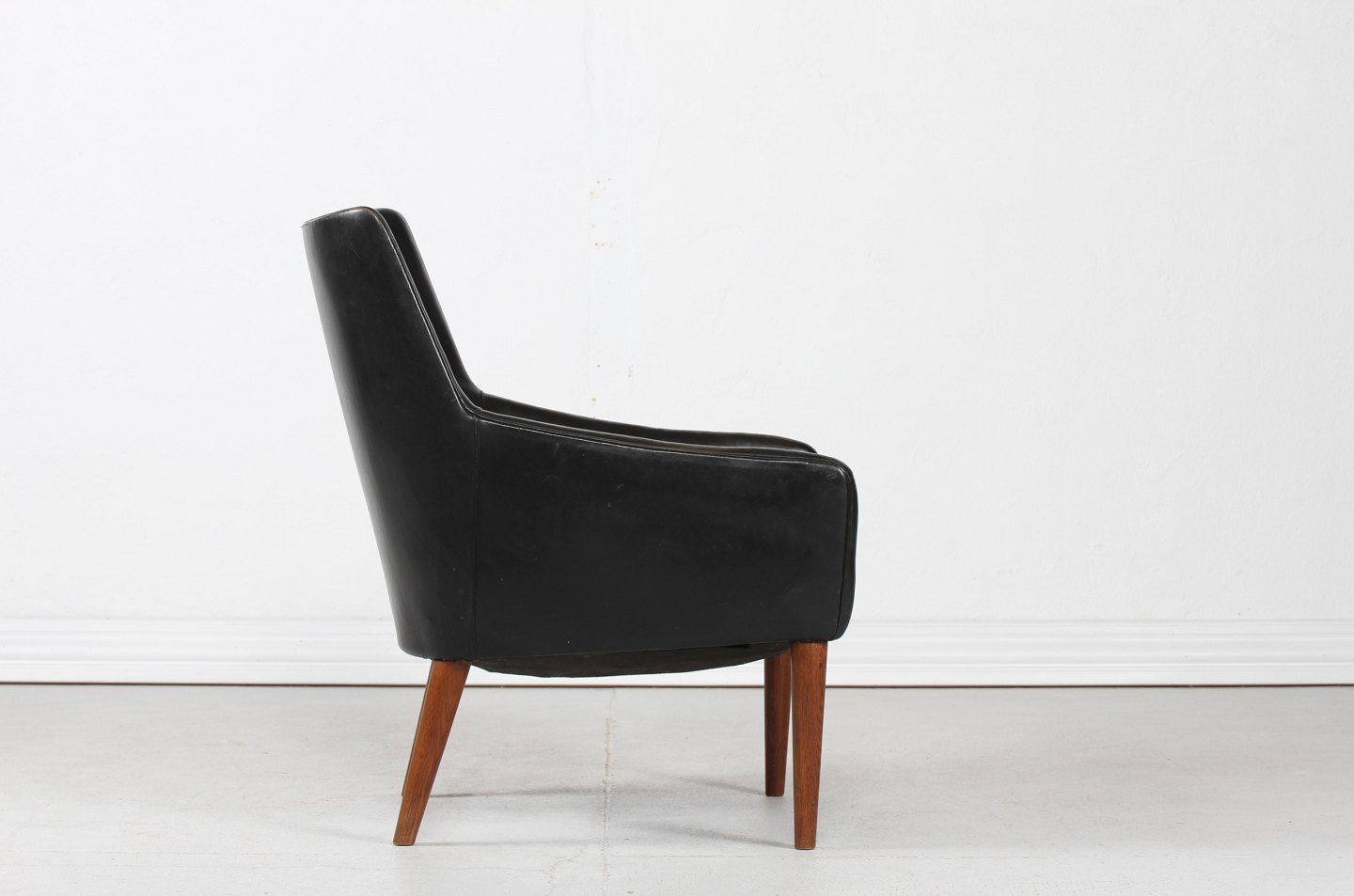 Dansk Møbeldesign Lille 1950'er lænestol betrukket med sort skai og ben af træ Dansk Møbelproducent Højde 80 cm Bredde 62 cm Dybde 74 cm Sædehøjde 39 cm Fin stand uden huller Stolen kan beses efter aftale