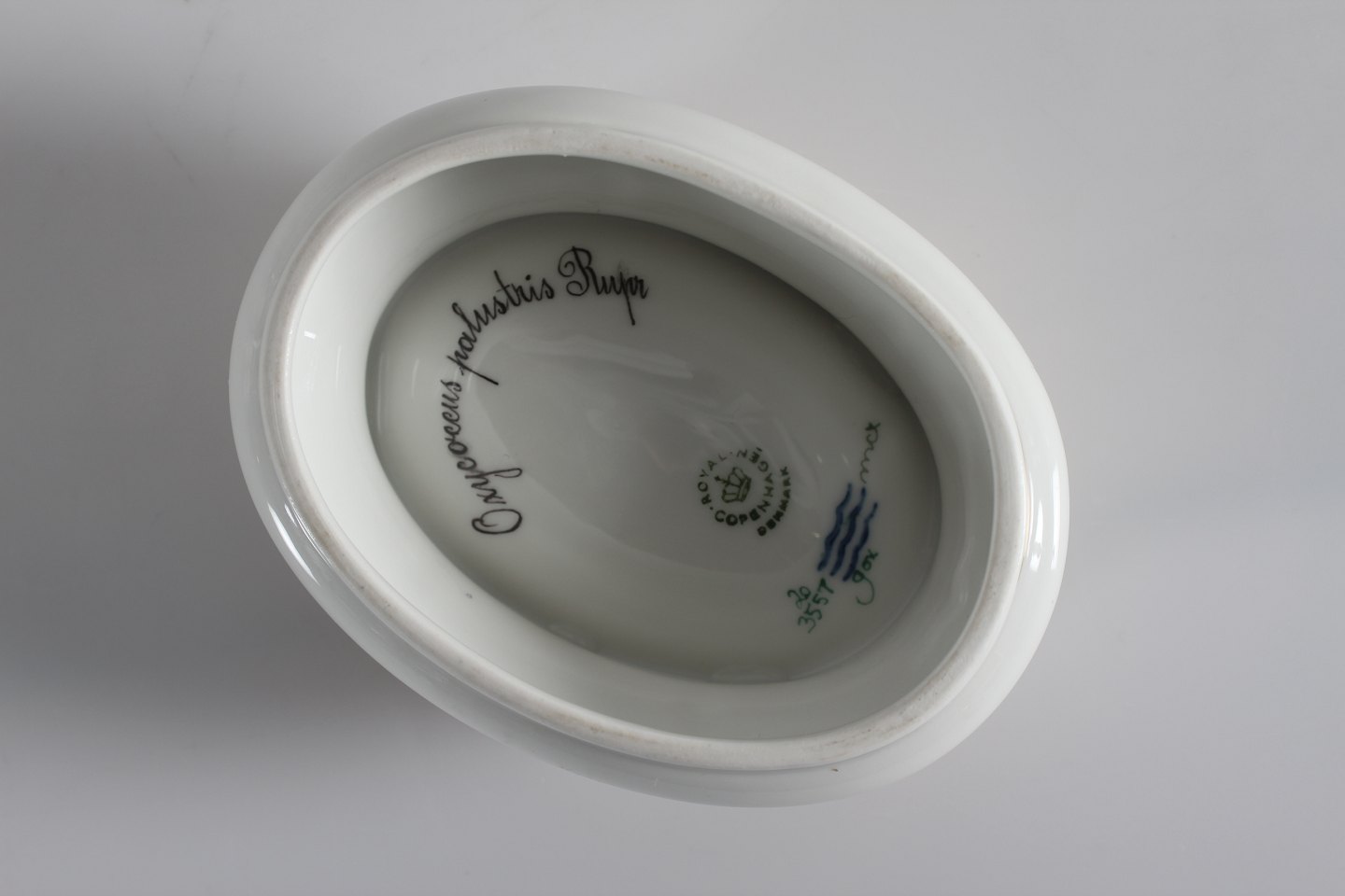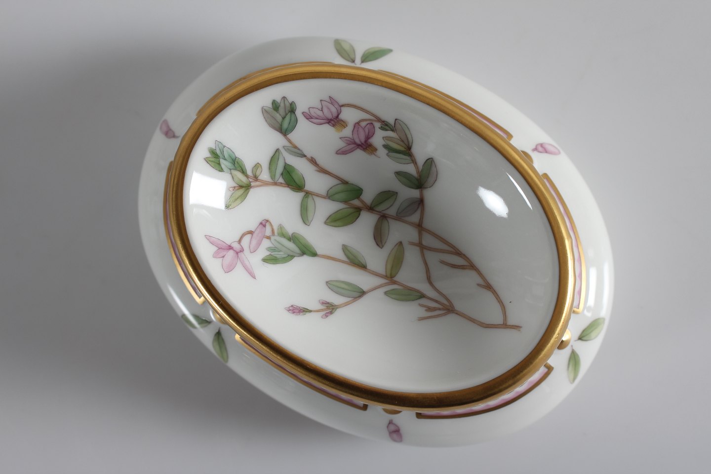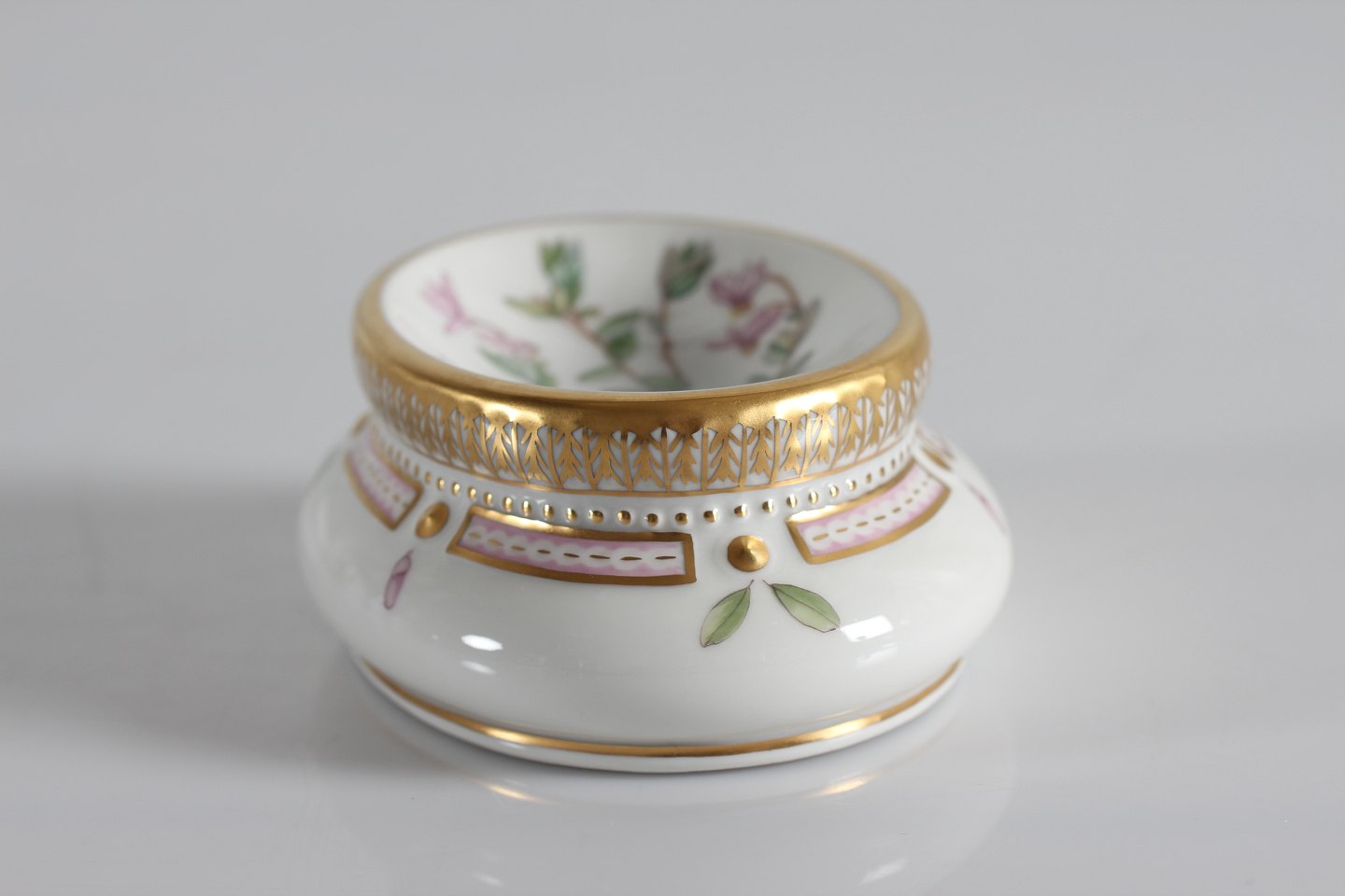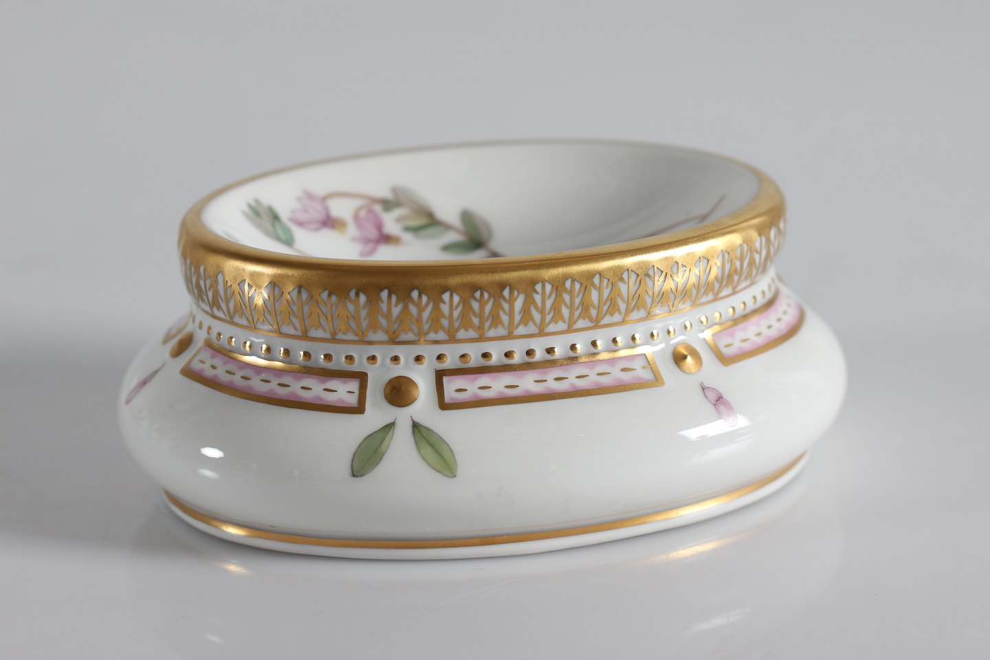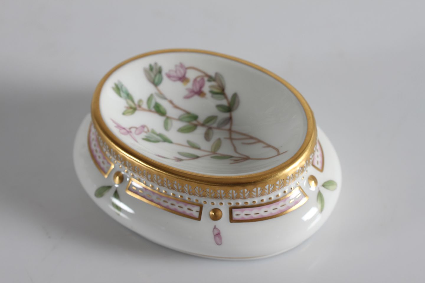 Royal Copenhagen Flora Danica Salt cellar model 3557 with flower decoration "Oxycoccus Palustris rupr" With Stamp from the period 1975-1979 Length 11 cm Width 8 cm Height 4,5 cm Mint condition 1. quality