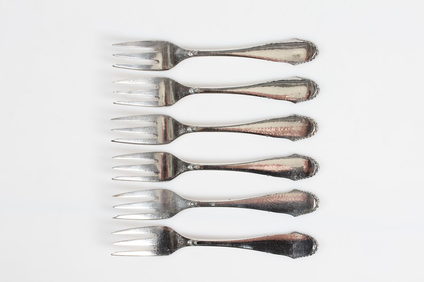 Christiansborg Sølvbestik _________________________ Ægte 3 tårnet hammerslået sølvbestik Christiansborg fremstillet af Svend Toxværds Sølvsmedie Kagegafler Længde 14,8 cm Fin stand uden monogram
