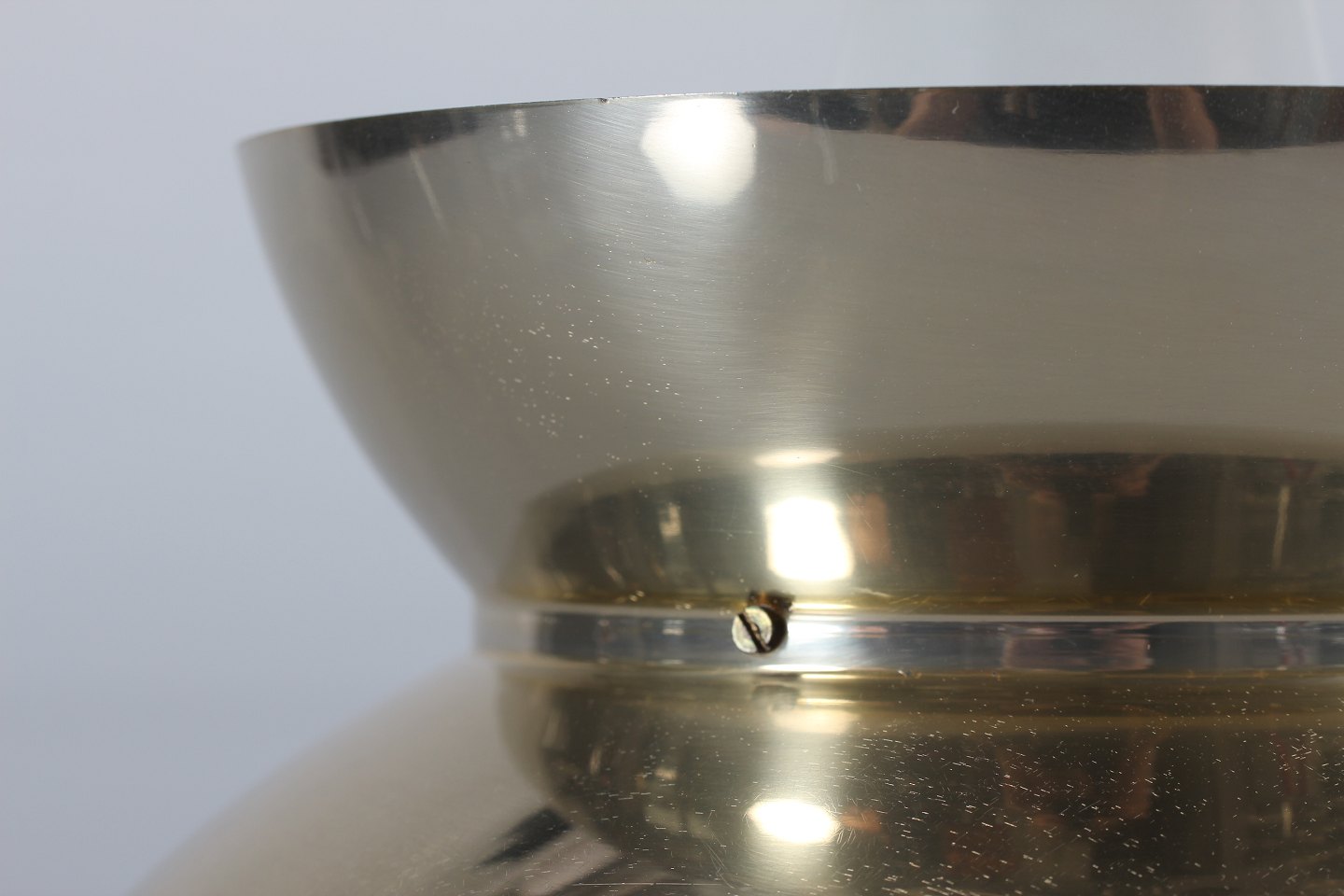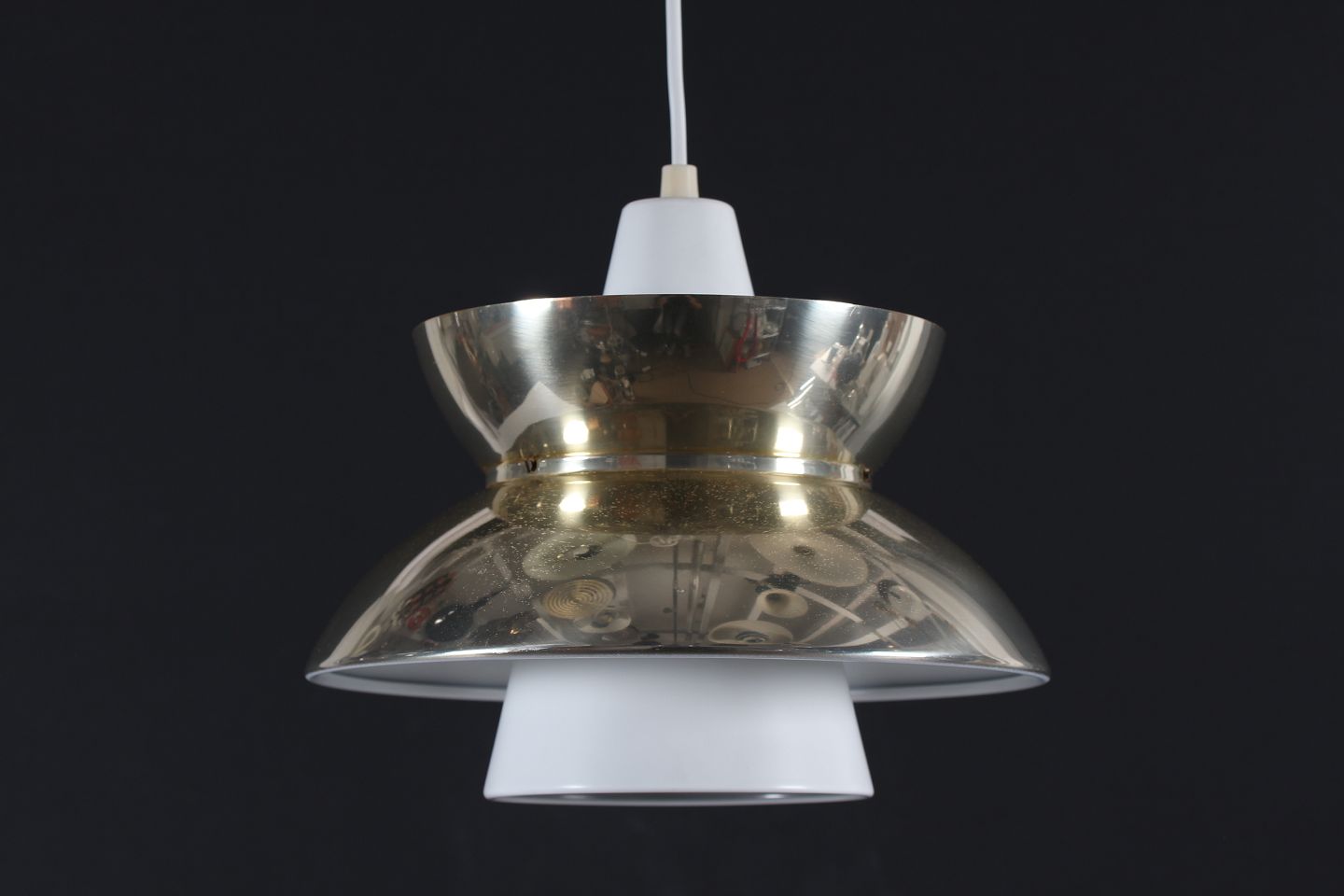 Søværnspendel Doo-Wop Søværnspendel fremstillet af metal med messingfarvet og hvid lakering Producent: Louis Poulsen A/S Højde 24 cm Diameter 28 cm Fin funktionsdygtig stand