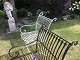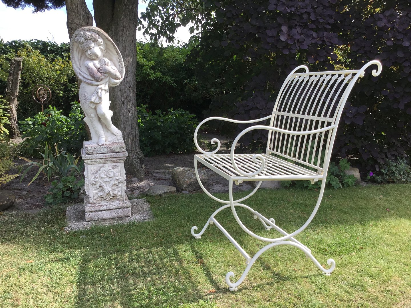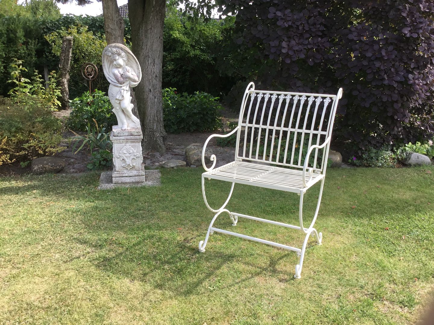 Havestol af smedejern Havestol med armlæn fremstillet af håndsmedet og hvidpatineret jern i god kraftig kvalitet Længde 53 cm Dybde 63 cm Højde 86 cm Sæde højde 44 cm Stolen kan beses efter aftale i vores butik