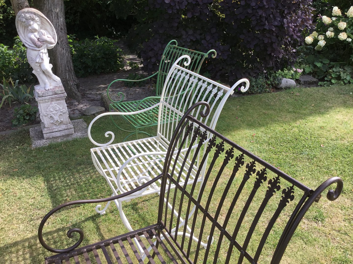 Havestol af smedejern Havestol med armlæn fremstillet af håndsmedet og brunpatineret jern i god kraftig kvalitet Bredde 53 cm Dybde 63 cm Højde 86 cm Sæde højde 44 cm Stolen kan beses i vores butik efter aftale