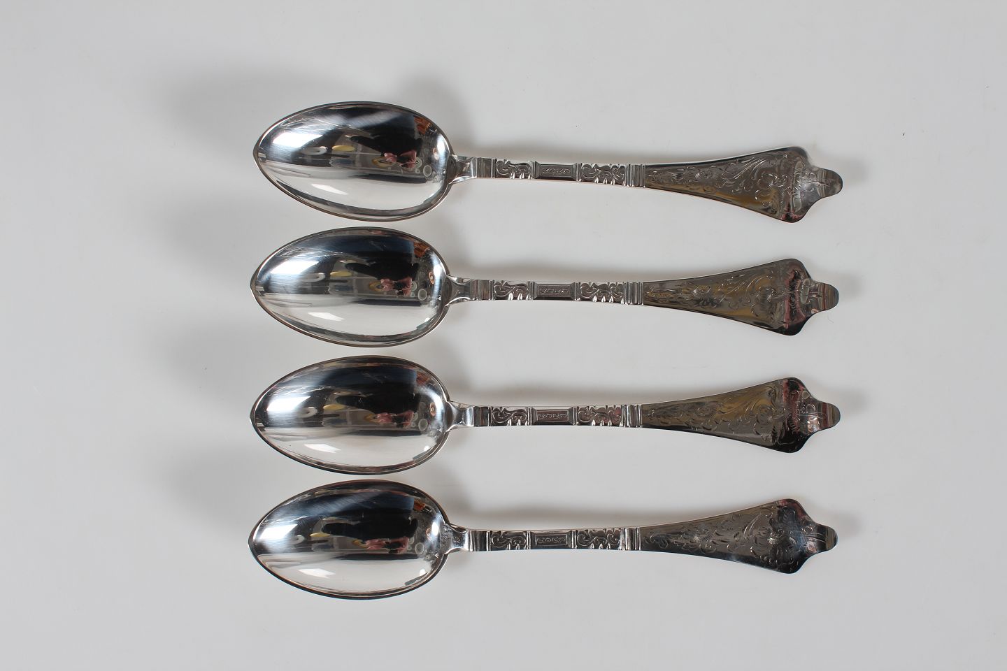 Antik Rococo Sølvbestik Antik Rococo bestik af 3 tårnet ægte sølv fremstillet af blandt andre Fredericia Sølvindustri Suppeskeer med håndgravering også på bagsiden Længde 22 cm Fin stand uden navnetræks indgraveringer