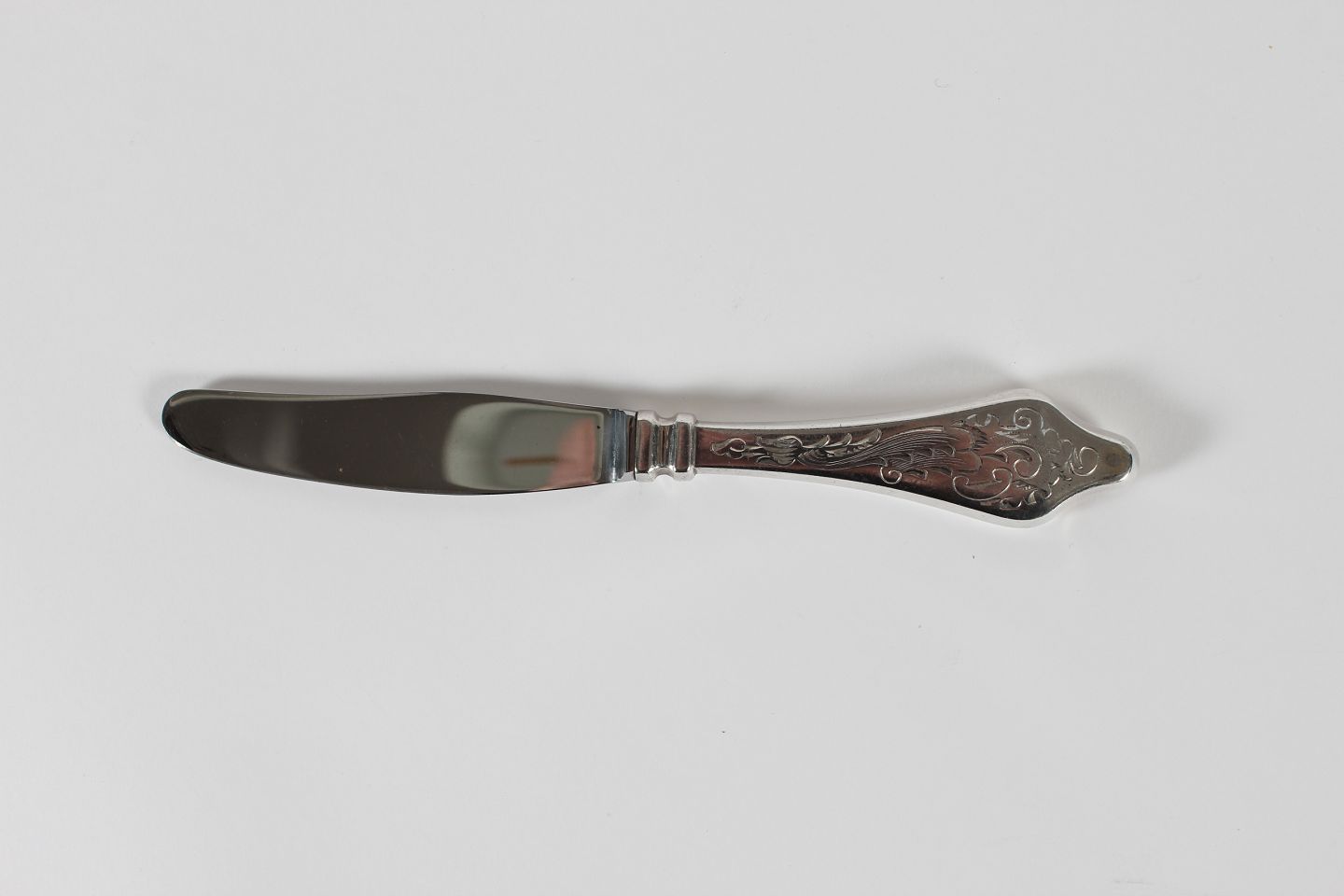 Antik Rococo Silver Flatvare Antik Rococo Flatvare of genuine silver by Fredericia Silver Factory Dinner knives with short blade and engraved pattern Length 20.5 cm Nice condition without engraving
