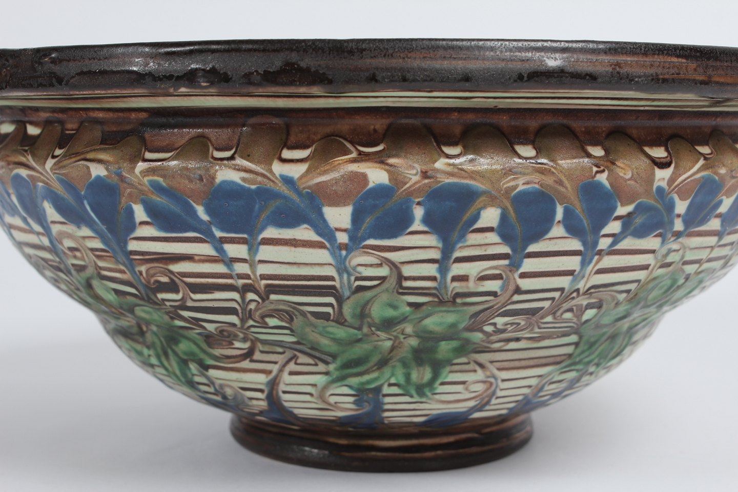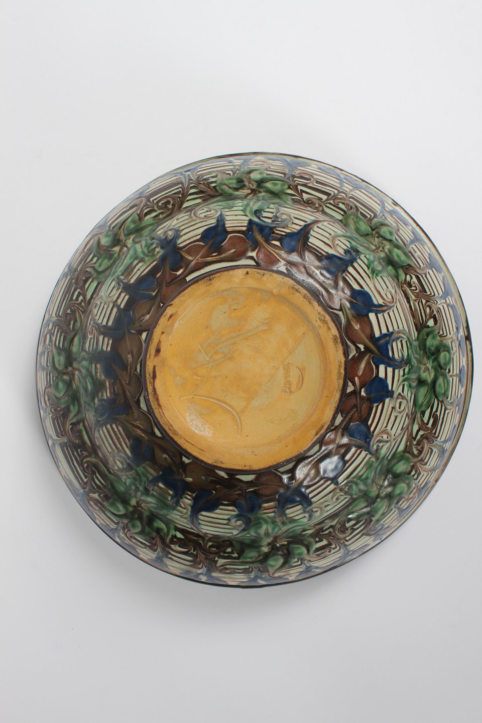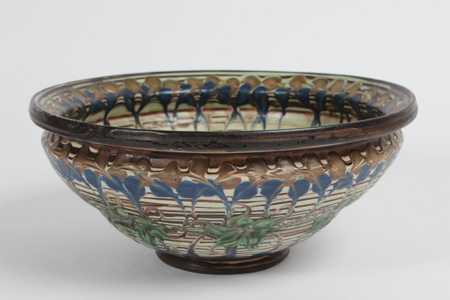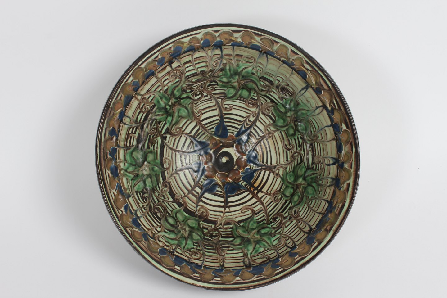 Herman A. Kähler Large ceramic bowl decorated with multicolored glaze by Jens Thirslund in the1930s Sign. HAK + Danmark Height 12 cm Diameter 28 cm Very nice vintage condition - without chips, cracks or repair