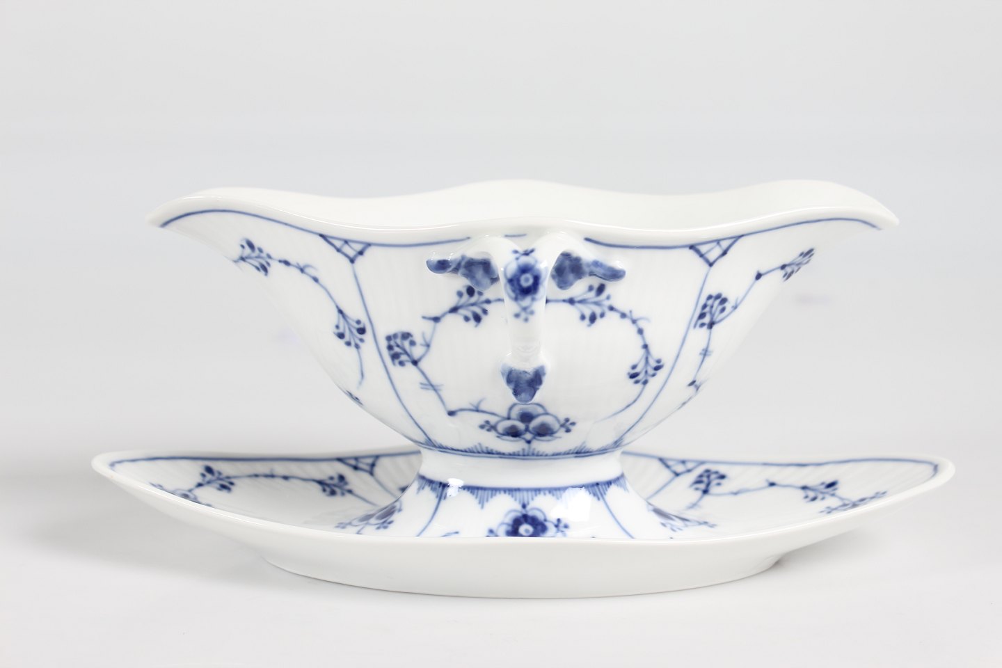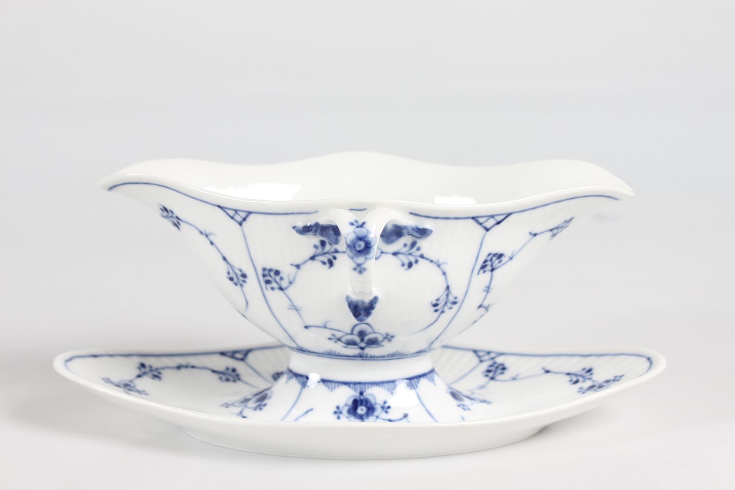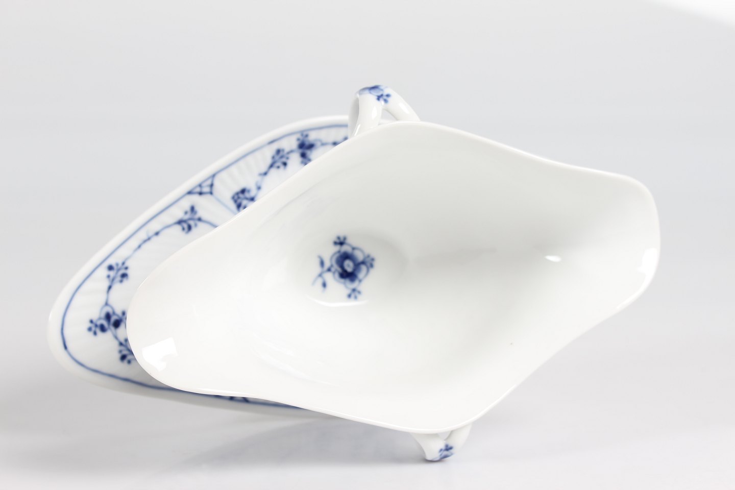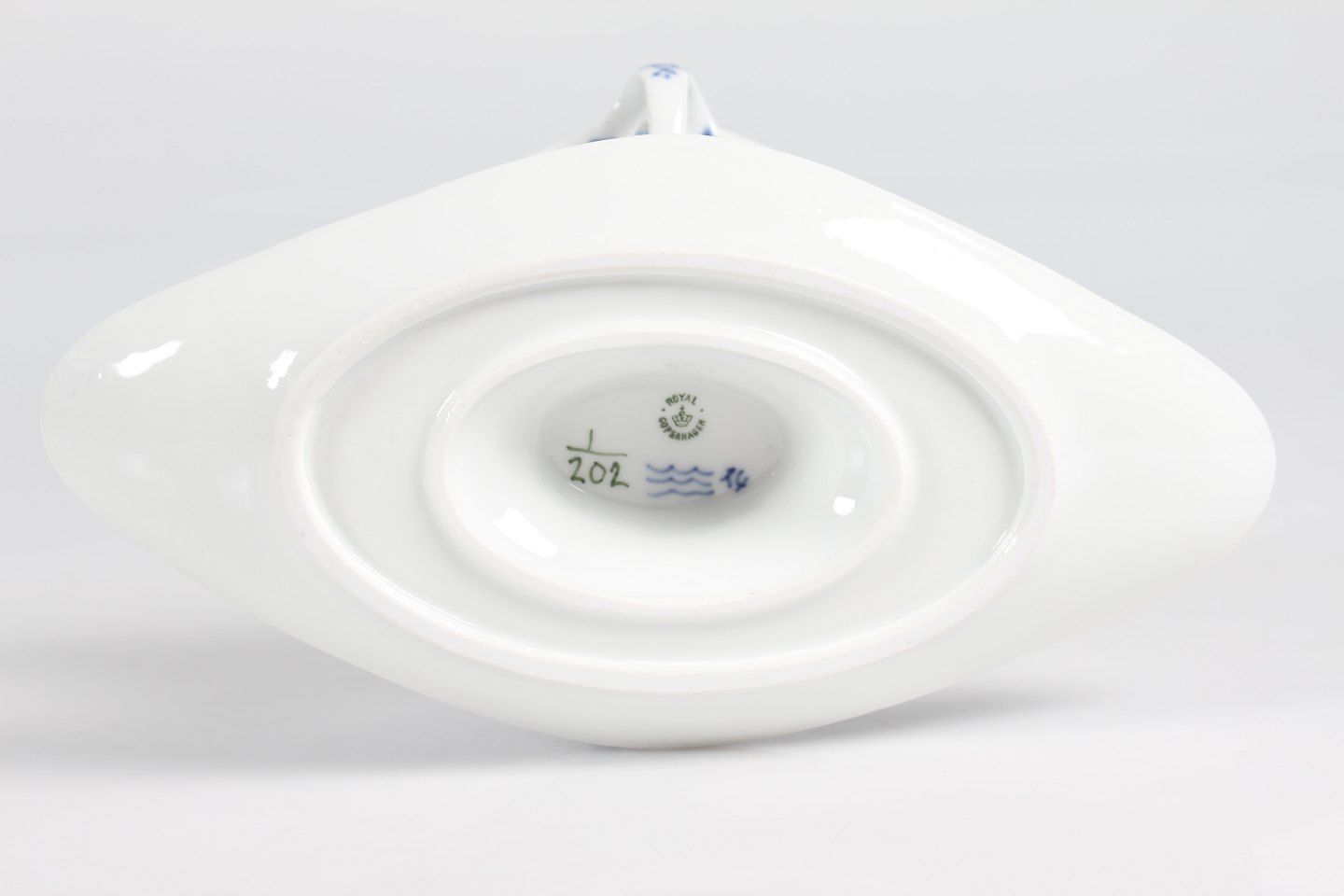 Royal Copenhagen musselmalet riflet Sauceskål med øre og på fast underfad nr. 1/202 Med stempel fra perioden 1894-1922 Længde 24,5 cm - højde 10,5 cm Fin fejlfri 1. sortering