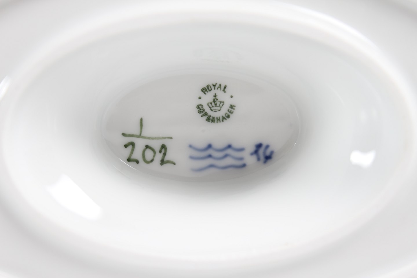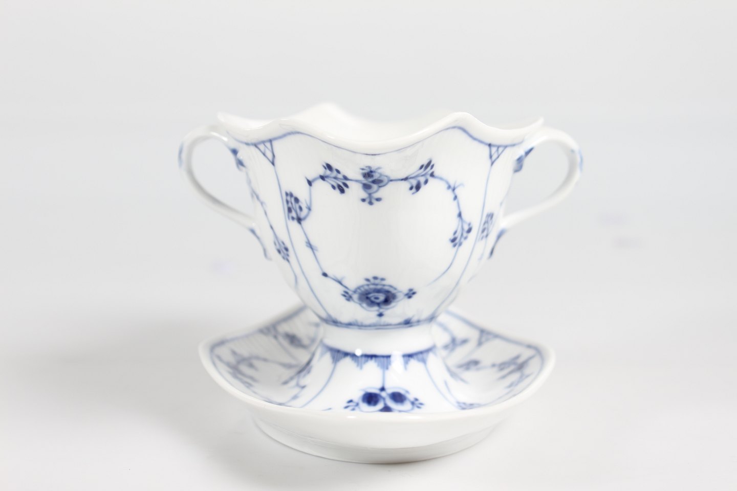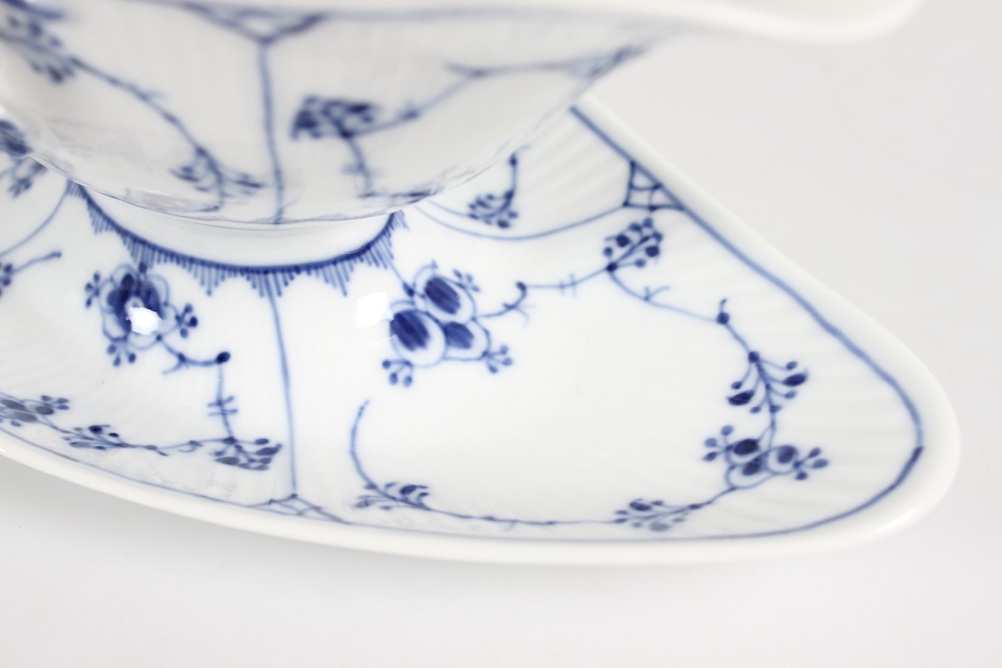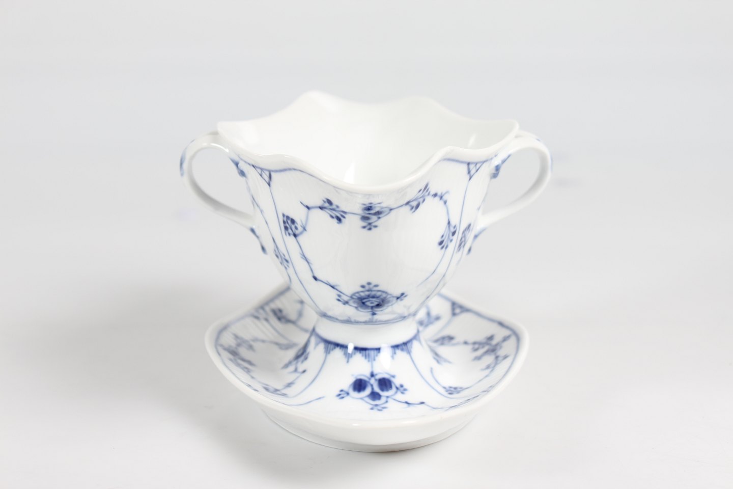 Royal Copenhagen musselmalet riflet Sauceskål med øre og på fast underfad nr. 1/202 Med stempel fra perioden 1894-1922 Længde 24,5 cm - højde 10,5 cm Fin fejlfri 1. sortering